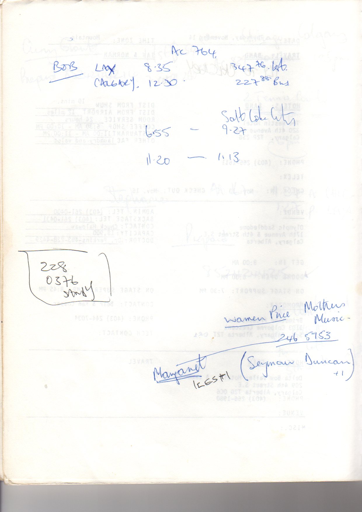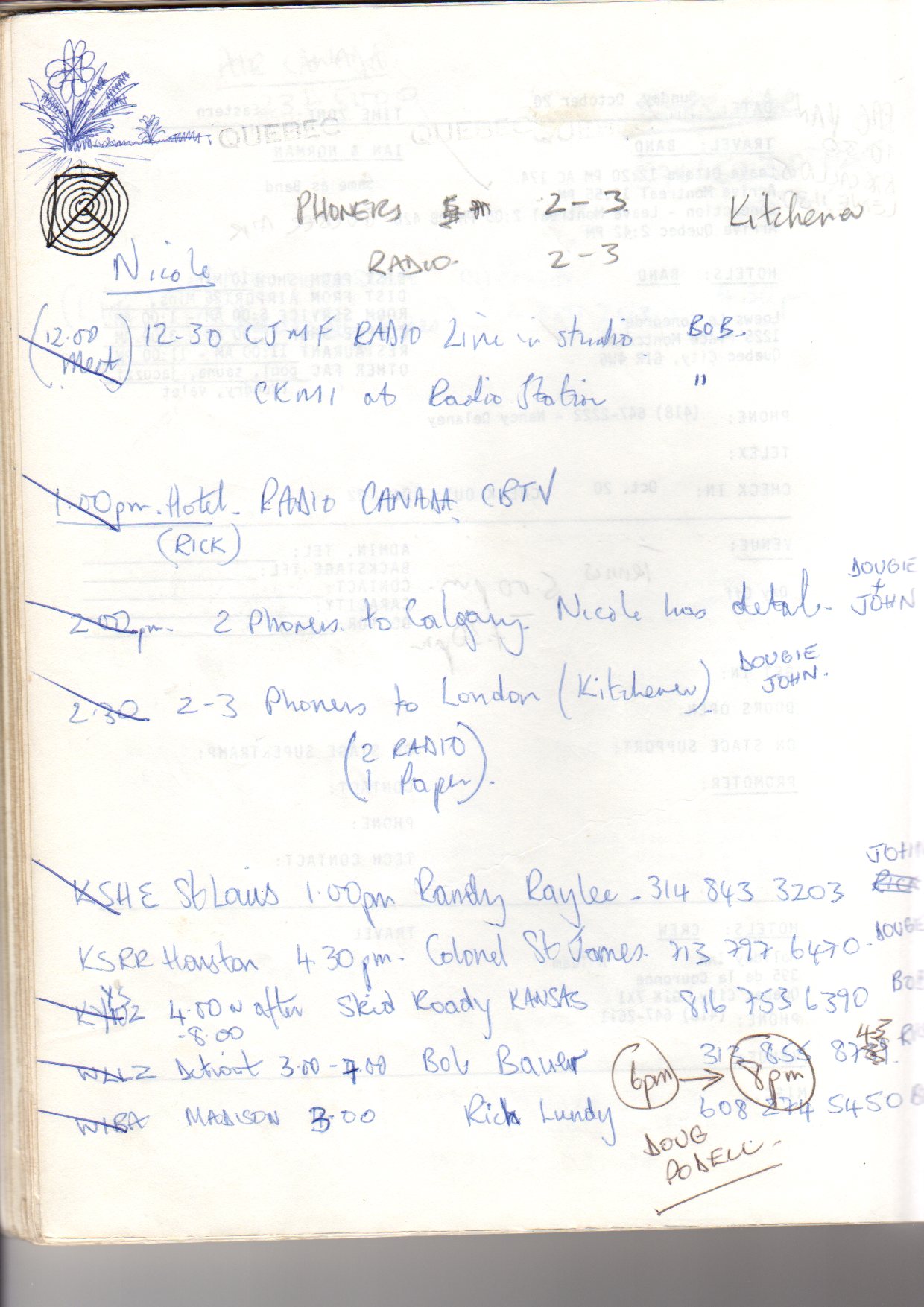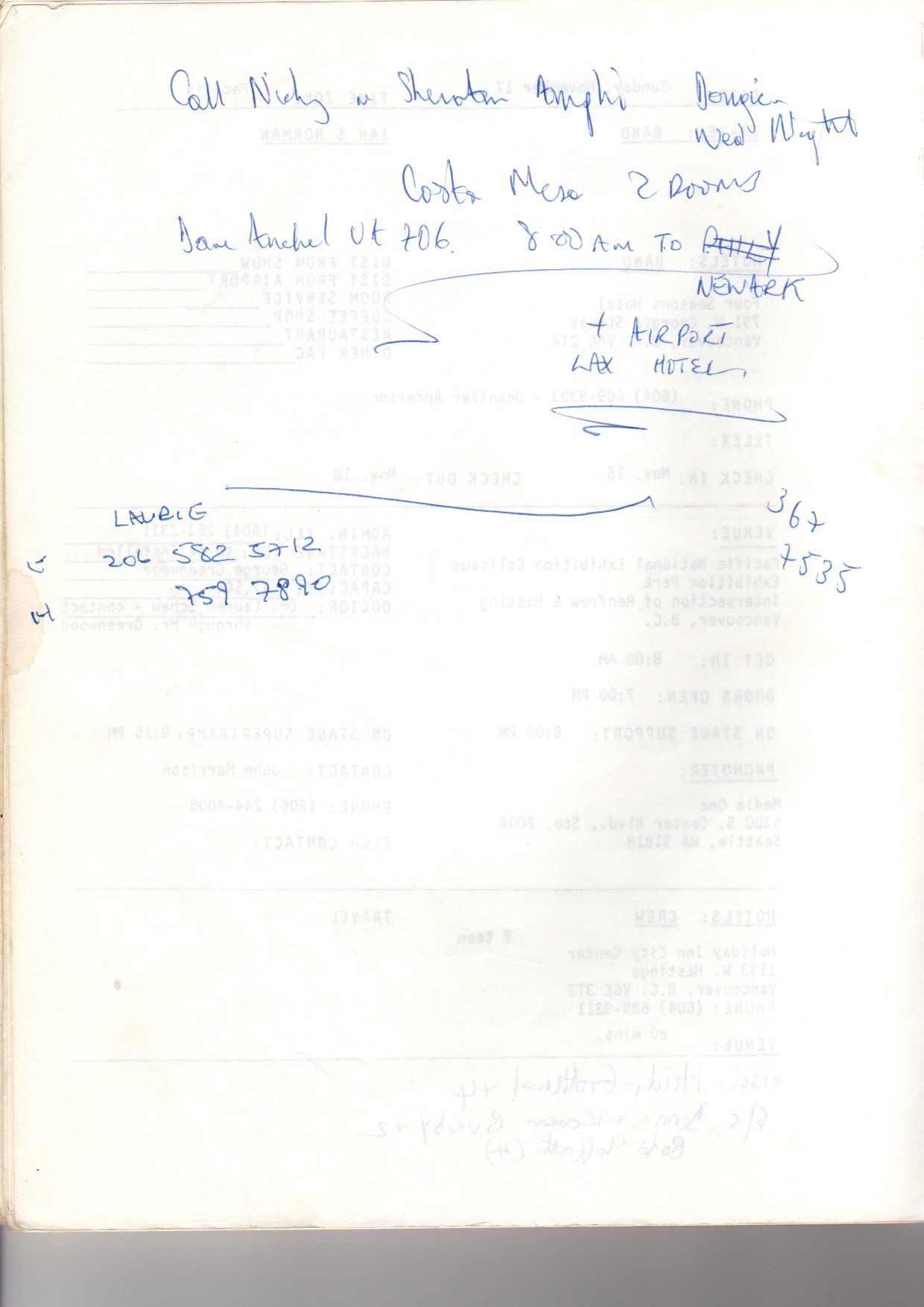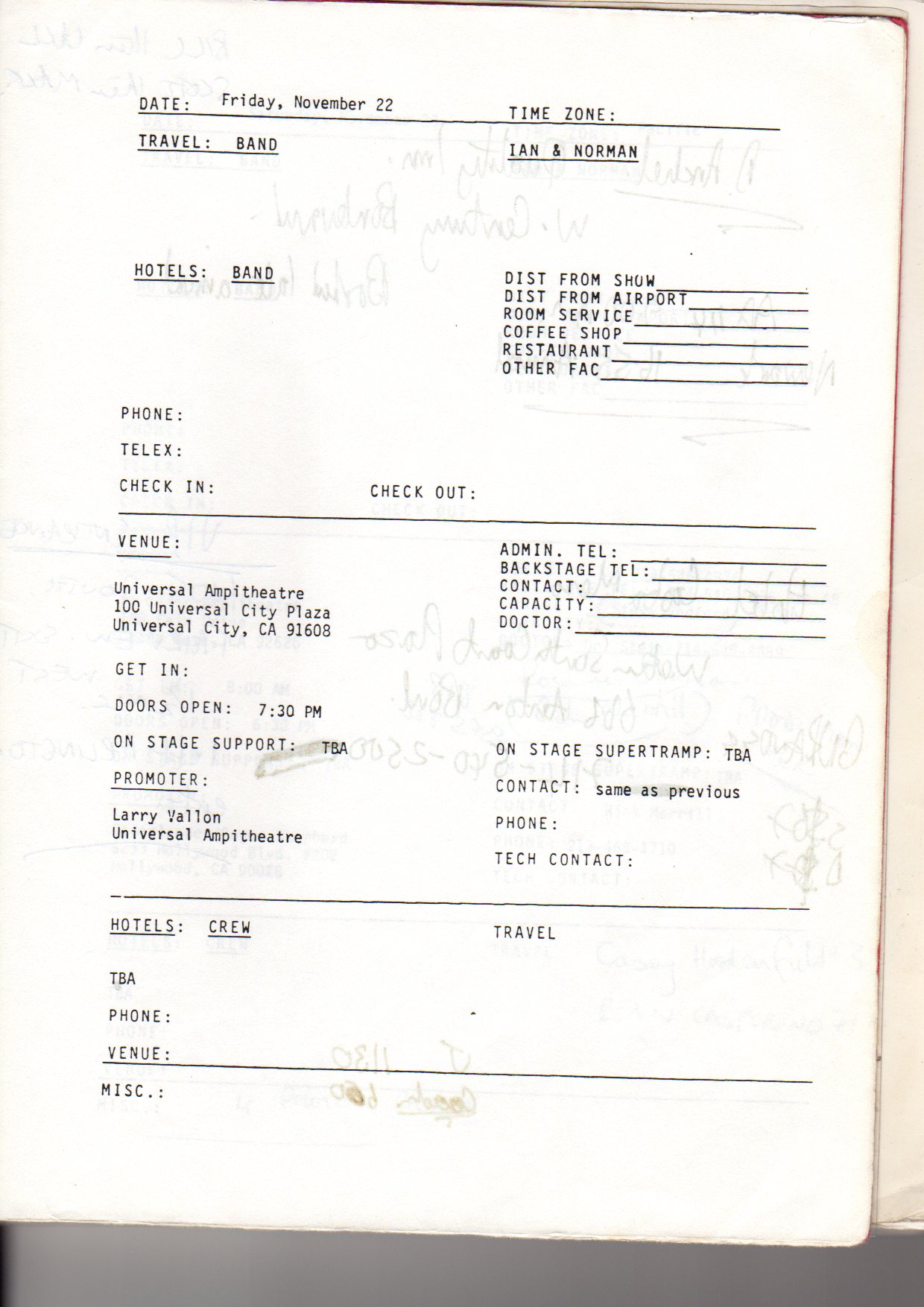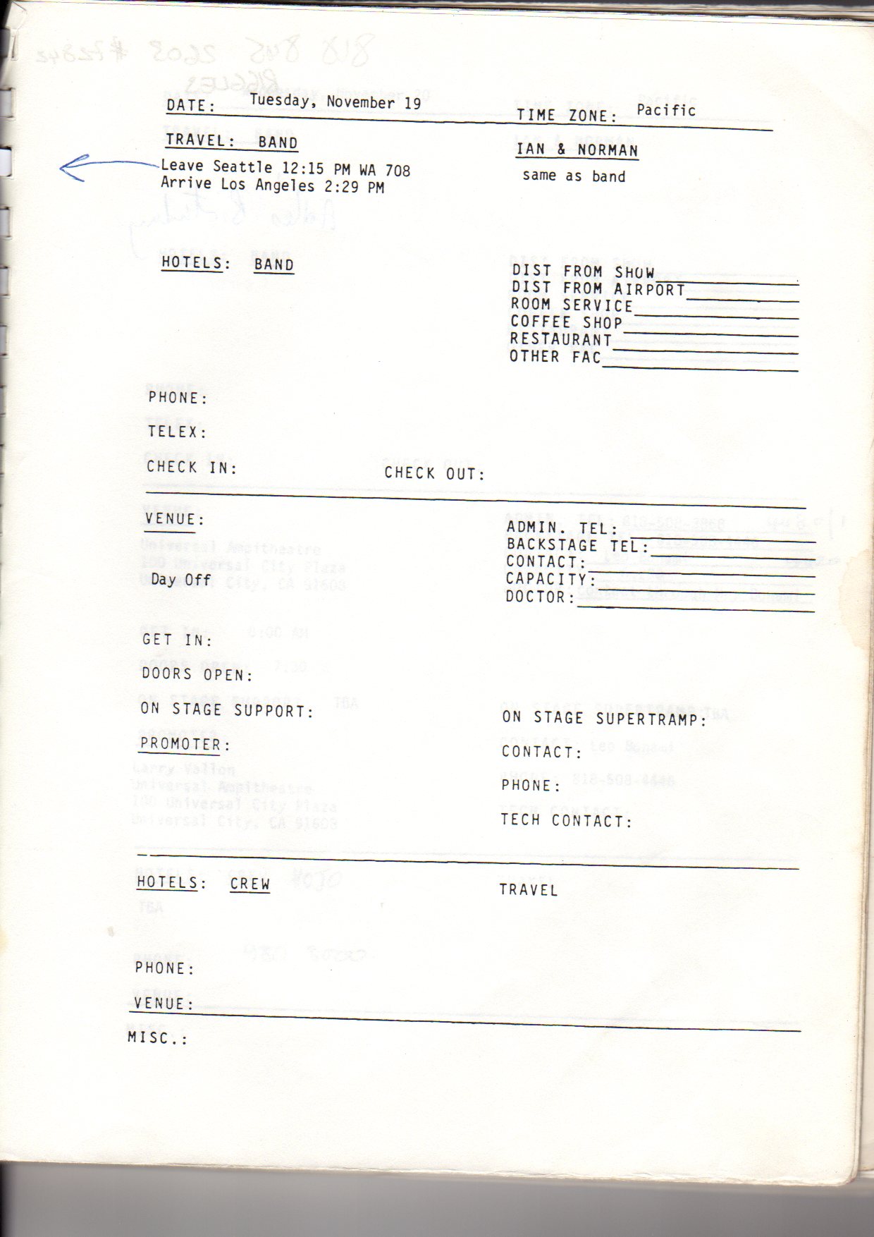 I get to stay with Rick and Sue Davies, in their home, and Sue and I set up the tour from her offices in Encino, around the corner from the house. We then travel 4000 miles to get to our first show, and we haven't left North America!!